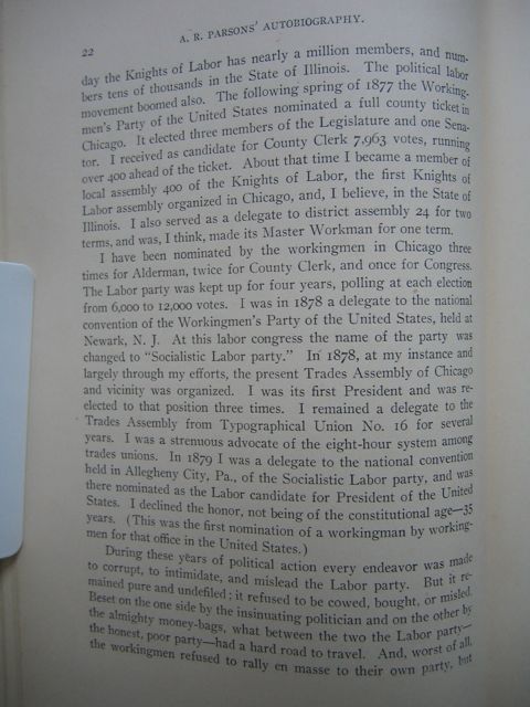 I have been nominated by the workingmen in Chicago three times for Alderman, twice for County Clerk, and once for Congress. The Labor party was kept up for four years, polling at each election from 6,000 to 12,000 votes. I was in 1878 a delegate for the convention of the Workingmen's Party of the United States, held at Newark, N. J. At this labor congress the name of the party was changed to "Socialist Labor party." In 1878, at my instance and largely through my efforts, the present Trades Assembly of Chicago and vicinity was organized. I was its first President and was reelected to that position three times. I remained a delegate to the Trades Assembly from Typographical Union No. 16 for several years. I was a strenuous advocate to the national convention held in Allegheny City, Pa., of the Socialistic Labor party, and was there nominated as the Labor candidate for President of the United States. I declined that honor, not being of the constitutional age—35 years. (This was the first nomination of a workingman by workingmen for that office in the United States.)