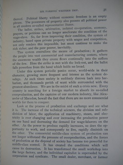 The ballot, strikes, arbitration, isolated co-operation, economy, prayers, or petitions can no longer ameliorate the condition of the wage-slave. So, far form improving their condition, the system of industry, based upon private property with wages and competition, not only renders this impossible, but must continue to make the rich richer, and the poor poorer inevitably.