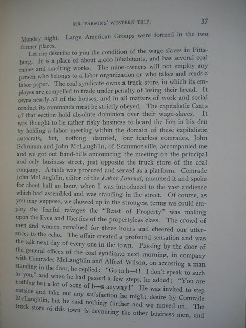 Let me describe to you the condition of the wage-slaves in Pittsburg. It is a place of about 4,000 inhabitants, and has several coal miners and smelting works. The mine-owners will not employ any person who belongs to a labor organization or who takes and reads a labor paper. The coal syndicate owns a truck store, in which its employers are compelled to trade under penalty of losing their bread. It owns nearly all of the houses, and in all matters of work and social conduct its commands must be strictly obeyed. The capitalistic Czars of that section hold absolute dominion over their wage-slaves. It was thought to be rather risky business to beard the lion in his den by holding a labor meeting within the domain of these capitalistic autocrats, but, nothing daunted, our fearless comrades, John Schrumm and John McLaughlin, of Scammonville, accompanied me and we got out hand-bills announcing the meting on the principle and only business street, just opposite the truck store of the coal company. A table was procured and served as a platform. Comrade John McLaughlin, editor of the Labor Journal, mounted it and spoke for about half an hour, when I was introduced to the vast audience which had assembled and was standing in the street. Of course, as you may suppose, we showed up in the strongest terms we could employ the fearful ravages the "Beast of Propety" was making upon the lives and liberties of the propertyless class. The crowd of men and women remained for three hours and cheered our utterances to the echo. The affair created a profound sensation was the talk next day of every one in the town. Passing by the door of the general offices of the coal syndicate next morning, in company with Comrades McLaughlin and Alfred Wilson, or accosting a man standing in the door, he replied: "Go to h--! I don't speak to such as you," and when he had passed a few steps, he added: "You are nothing but a lot of sons of b—s anyway!" He was invited to step outside and take out any satisfaction he might desire by Comrade McLaughlin, but he said nothing further and we moved on. The truck store of this town is devouring the other business men, and