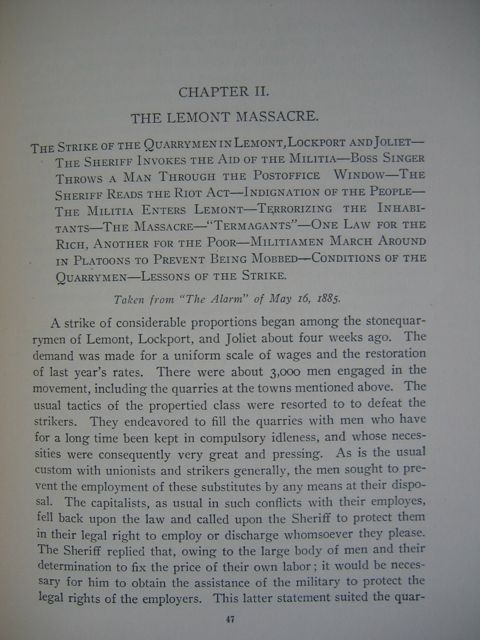 THE STRIKE OF THE QUARRYMEN IN LEMONT, LOCKPORT, AND JOLIET—THE SHERIFF INVOKES THE AID OF THE MILITIA—BOSS SINGER THROWS A MAN THROUGH THE POSTOFFICE WINDOW—THE SHERIFF READS THE RIOT ACT—INDIGNATION OF THE PEOPLE—THE MILITIA ENTERS LEMONET—TERROIZE THE INHABITANTS—THE MASSCRE—"TERMAGANTS"—ONE LAW FOR THE RICH, ANOTHER FOR THE POOR—MILITIAMEN MARCH AROUND IN PLATOONS TO PREVENT BEING MOBBED—CONDITIONS OF THE QUARRYMEN—LESSONS OF THE STRIKE.