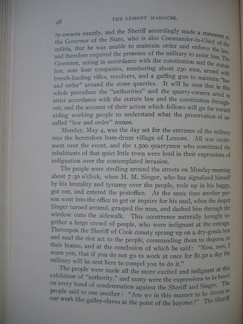 The people were strolling around the streets on Monday morning about 7:300 o'clock, when H. M. Singer, who has signalized himself by his brutality and tyranny over the people, rode up in his buggy, got out, and entered the postoffice. At the same time another person went into the office to get or inquire for his mail, when the despot Singer turned around, grasped the man, and dashed him through the window onto the sidewalk. This occurrence naturally brought together a large crowd of people, who were indignant at the outrage. Thereupon the Sheriff of Cook county sprang up on a dry-goods box and read the riot act to the people, commanding them to disperse to their homes, and at the conclusion of which he said: "Now, men, I warn you, that if you do not go to work at once for $1.50 a day the military will be sent here to compel you to do it."