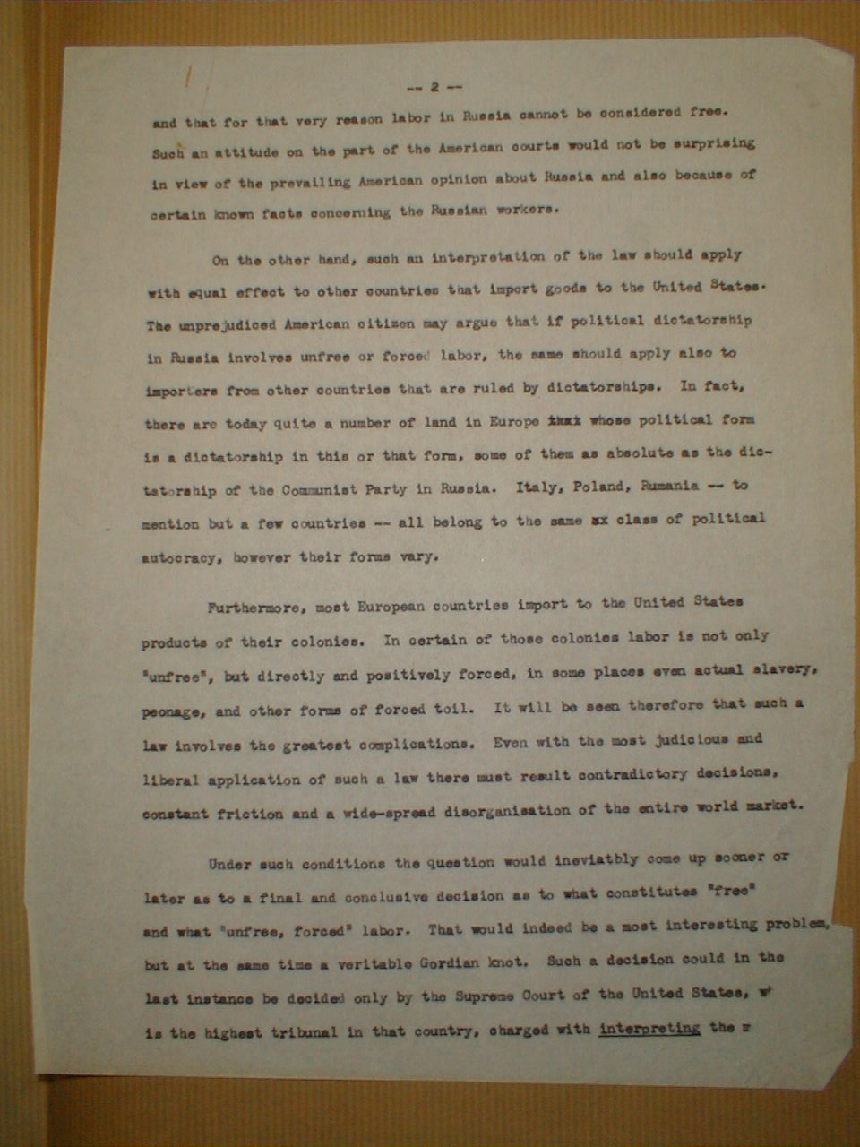 Under such conditions the question would inevitbly [sic] come up sooner or later as to a final and conclusive decision as to what constitutes "free" and what "unfree, forced" labor. That would indeed be a most interesting problem, but at the same time a veritable Gordian knot. Such a decision could in the last instance be decided only by the Supreme Court of the United States, which is the highest tribunal in that country, charged with interpreting the meaning
