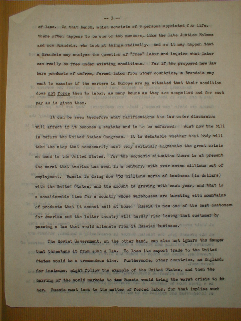 of laws. On that bench, which consists of 9 persons appointed for life, there often happens to be one or two members, like the late Justice Holmes and now Brandeis, who look at things radically. And so it may happen that a Brandeis may analyse the question of "free" labor and inquire what labor can really be free under existing conditions. For if the proposed new law bars products of unfree, forced labor from other countries, a Brandeis may want to examine if the workers in Europe are so situated that their condition does not force them to labor, as many hours as they are compelled and for such pay as is given them.