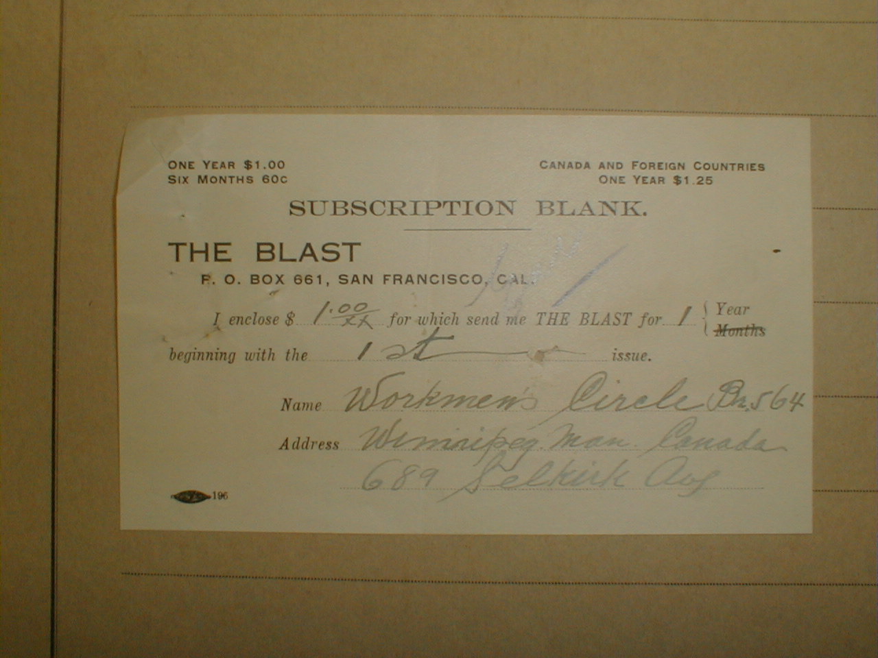 Subscription form (part of the International Institute for Social History's Alexander Berkman archive and appears in Anarchy Archives with ISSH's permission):