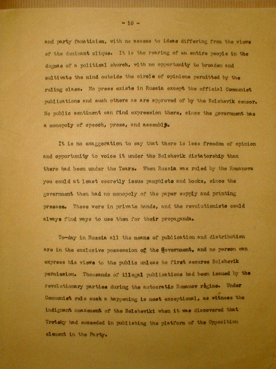 It is no exaggeration to say that there is less freedom of opinion and opportunity to voice it under the Bolshevik dictatorship than there had been under the Tsars. When Russia was ruled by the Romanovs you could at least secretly issue pamphlets and books, since the government then had no monopoly of the paper supply and printing presses. These were in private hands, and the revolutionists could always find ways to use them for their propaganda.