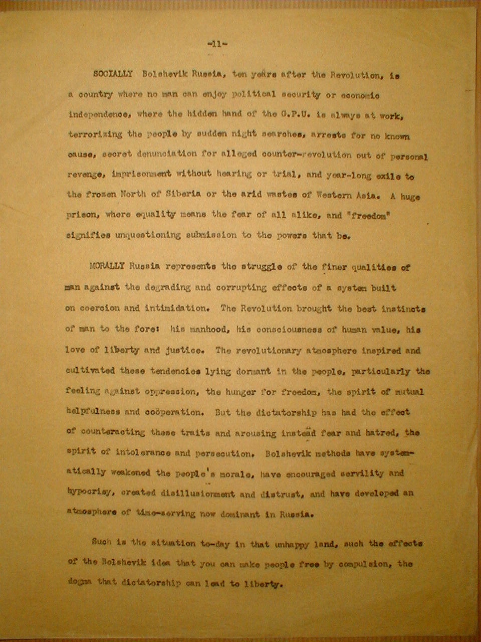 MORALLY Russia represents the struggle of the finer qualities of man against the degrading and corrupting effects of a system built on coercion and intimidation. The Revolution brought the best instincts of man to the fore: his manhood, his consciousness of human value, his love of liberty and justice. The revolutionary atmosphere inspired and cultivated these tendencies lying dormant in the people, particularly the feeling against oppression, the hunger for freedom, the spirit of mutual helpfulness and cooperation. But the dictatorship has had the effect of counteracting these traits and arousing instead fear and hatred, the spirit of intolerance and persecution. Bolshevik methods have systematically weakened the people's morale, have encouraged servility and hypocrisy, created disillusionment and distrust, and have developed an atmosphere of time-serving now dominant in Russia.