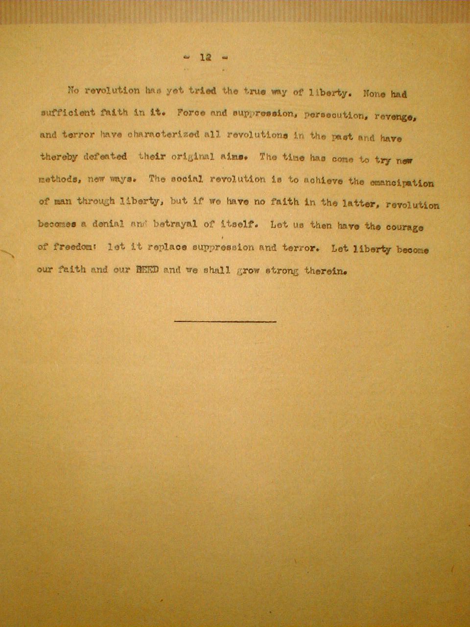 No revolution has yet tried the true way of liberty. None had sufficient faith in it. Force and suppression, persecution, revenge, and terror have characterized all revolutions in the past and have thereby defeated their original aims. The time has come to try new methods, new ways. The social revolution is to achieve the emancipation of man through liberty, but if we have no faith in the latter, revolution becomes a denial and betrayal of itself. Let us then have the courage of freedom: let it replace suppression and terror. Let liberty become our faith and our NEED and we shall grow strong therein.