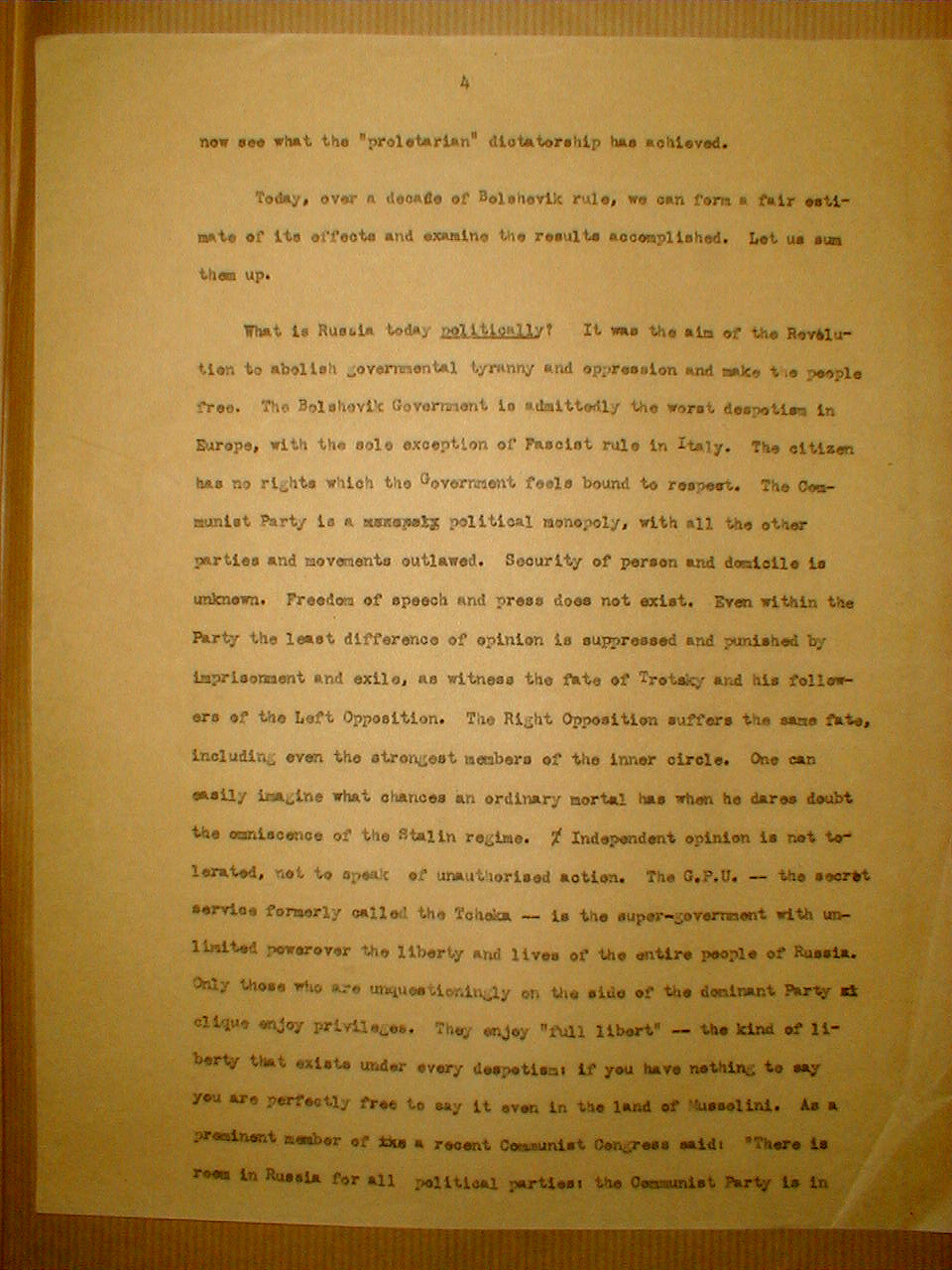 What is Russia today politically! It was the aim of the Revolution to abolish governmental tyranny and oppression and make the people free. The Bolshevik Government is admittedly the worst despotism in Europe, with the sole exception of Fascist rule in Italy. The citizen has no rights which the Government feels bound to respect. The Communist Party is a political monopoly, with all the other parties and movements outlawed. Security of person and domicile is unknown. Freedom of speech and press does not exist. Even within the Party the least difference of opinion is suppressed and punished by imprisonment and exile, as witness the fate of Trotsky and his followers of the Left Opposition. The Right Opposition suffers the same fate, including even the strongest members of the inner circle. One can easily imagine what chances an ordinary mortal has when he dares doubt the omniscience of the Stalin regime. Independent opinion is not tolerated, not to speak of unauthorized motion. The G.P.U -- the secret service formerly called the Tcheka -- is the super-government with unlimited power over the liberty and lives of the entire people of Russia. Only those who are unquestionably on the side of the dominant Part clique enjoy privileges. They enjoy "full libert" -- the kind of liberty that exists under every despotism: if you have nothing to say you are perfectly free to say it even in the land of Mussolini. As a prominent member of its a recent Communist Congress said: "there is room in Russia for all political parties: the Communist Party is in
