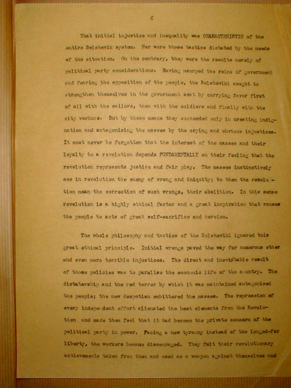 That initial injustice and inequality was CHARACTERISTIC of the entire Bolshevik system. Nor were those tactics dictated by the needs of the situation. On the contrary, they were the results merely of political party considerations. Having usurped the reins of government and fearing the opposition of the people, the Bolsheviki sought to strengthen themselves in the government seat by currying favor first of all with the sailors, then with the soldiers and finally with the city workers. But by those means they succeeded only in creating indignation and antagonism the masses by the crying and obvious injustices. It must never be forgotten that the interest of the masses and their loyalty to a revolution depends FUNDAMENTALLY on their feeling that they revolution represents justice and fair play. The masses instinctively see in revolution the enemy of wrong and iniquity; to them the revolution mean the correction of such wrong, their abolition. In this sense revolution is a highly ethical factor and a great inspiration that rouses the people to acts of great self-sacrifice and heroism.