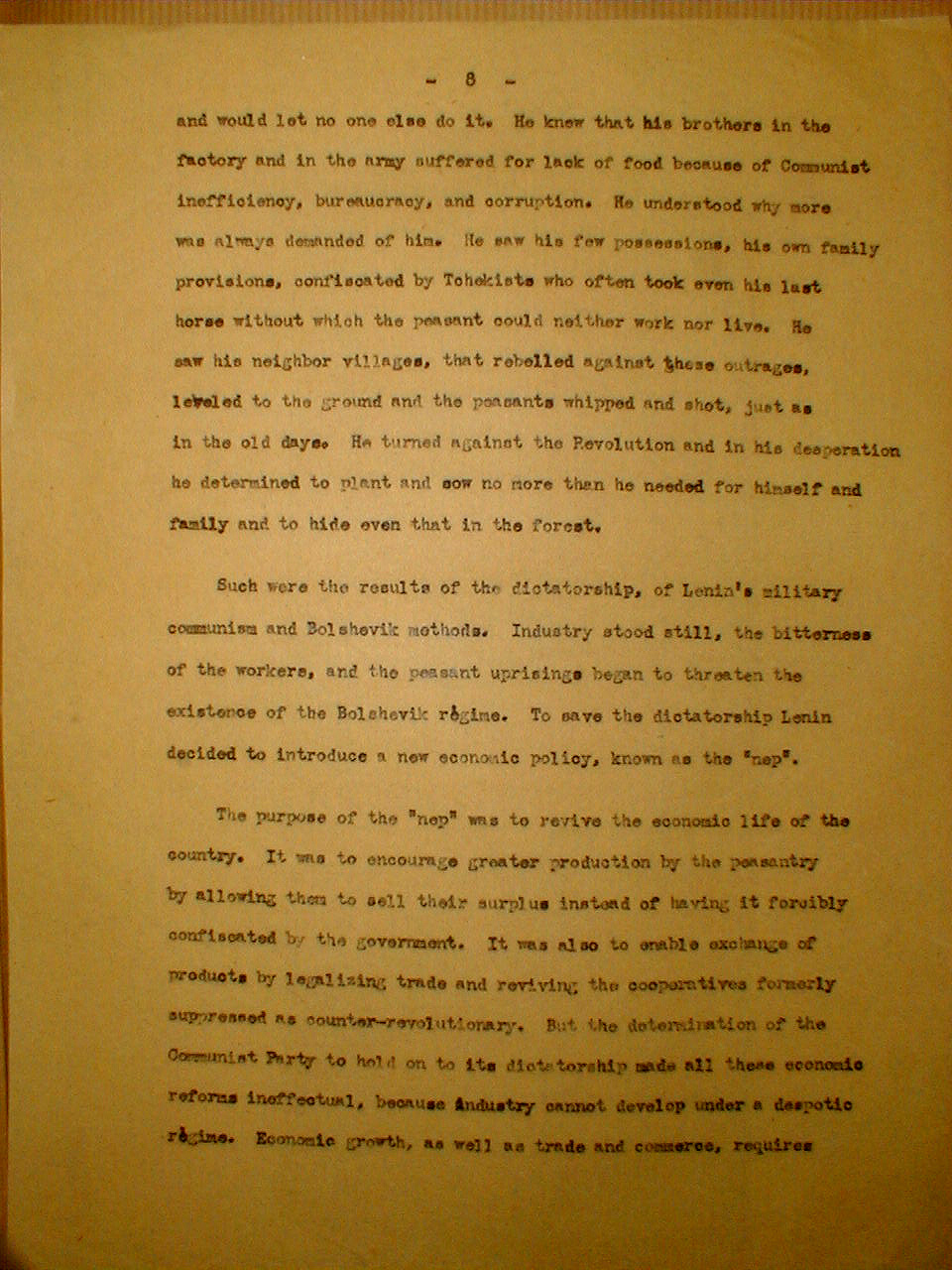 The purpose of the "nep" was to revive the economic life of the country. It was to encourage greater production by the peasantry by allowing them to sell their surplus instead of having it forcibly confiscated by the government. It was also to enable exchange of products by legalizing trade and reviving the cooperatives formerly suppressed as counter-revolutionary. But the determination of the Communist Party to hold on to its dictatorship made all these economic reforms ineffectual, because industry cannot develop under a despotic regime. Economic growth, as well as trade and commerce, requires
