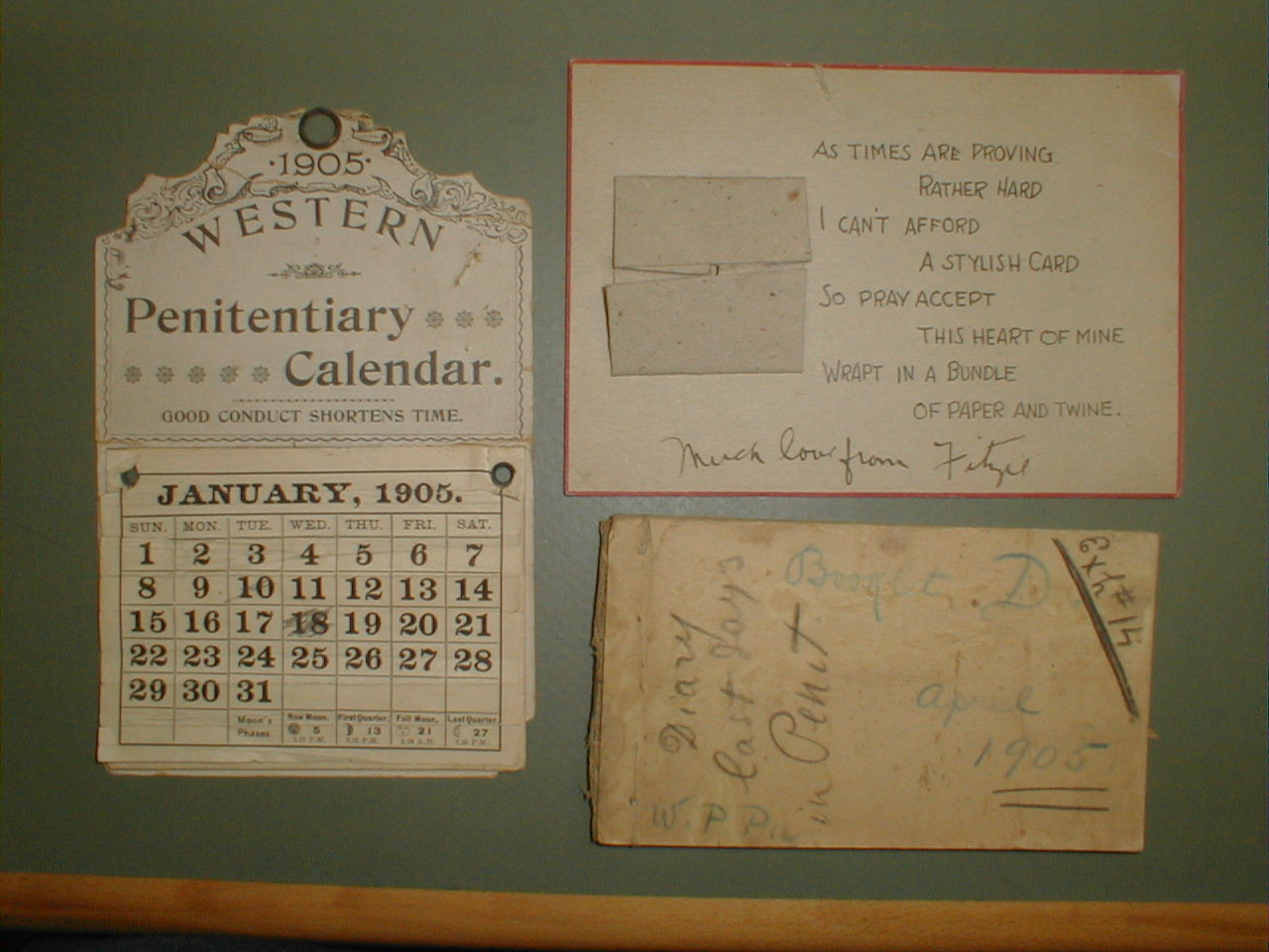 Calander, card from Fitzie, and notebook.