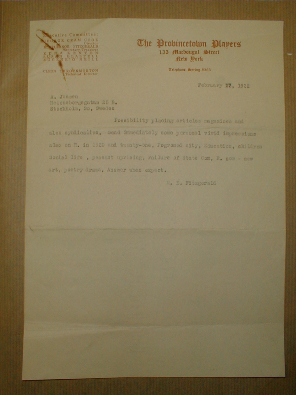 Possibility placing articles magazines and also syndicalize. Send immediately some personal vivid impressions also on R. in 1920 and twenty-one, Pogromed city, Education, children, Social Life, peasant uprising, Failure of State Com, R. now - new art, poetry, drama. Answer when expect.