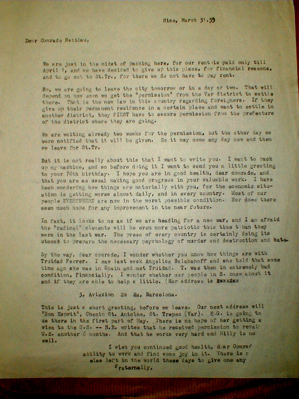 By the way, dear comrade, I wonder whether you know how things are with Truidad Ferrer. I saw last week Angelica Ballbanoff and she told that some time ago she was in Spain and met Truidad. T. was then in extremely bad condition, financially. I wonder whether out people in S. know about it and if they are able to help a little. (Her address is xxxxxxx