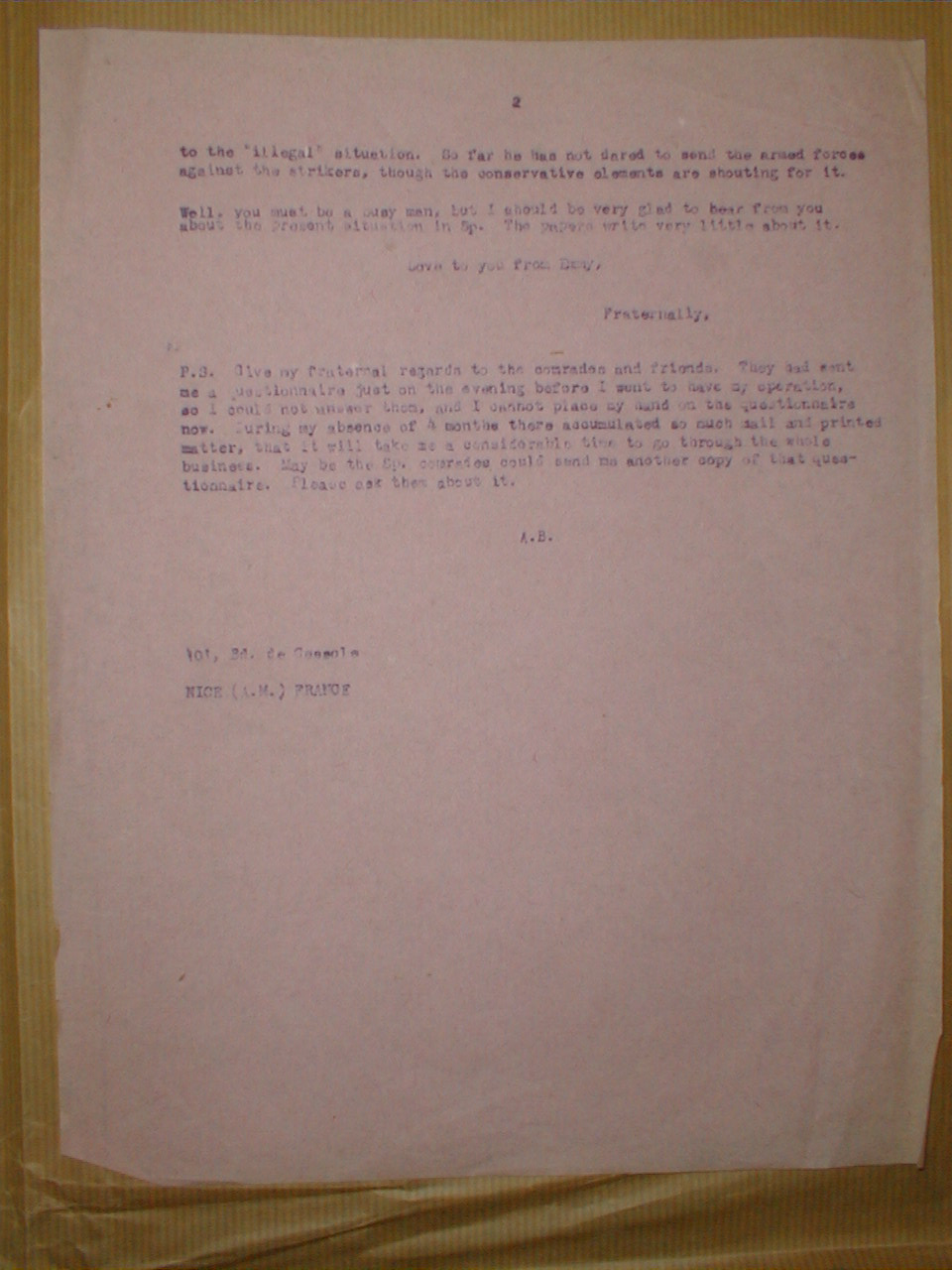 And how are you dear comrade? You did not mention about yourself, nor about conditions in Sp. Of course you are informed about the strike movement in this country. It is an encouraging event-- a country-side, strike on the job, bras crointe, of the workers own initiative and organized and conducted by the workers themselves. And successfully, at that. In fact, the leaders are getting frightened (the would-be political and labor leaders) at the extent and determination of the movement. And Blum is thinking of putting and end soon |