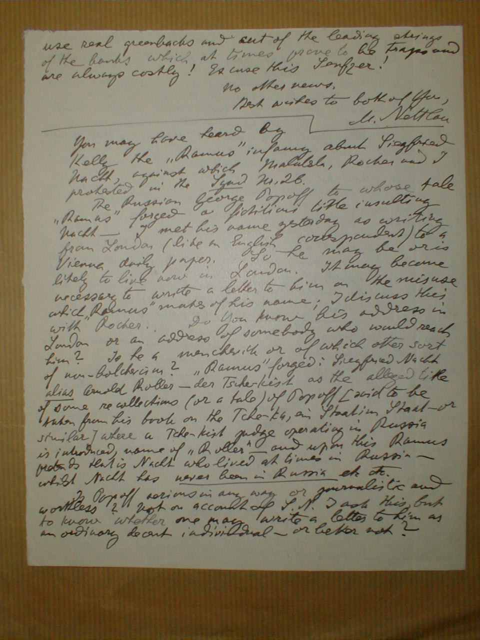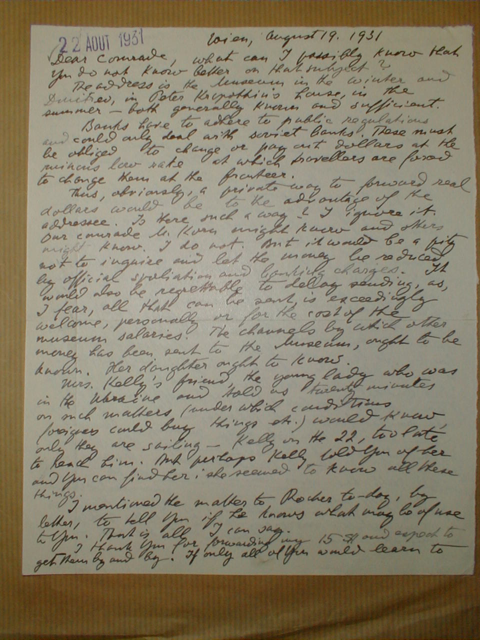 Thus, obviously, a private way to forward real dollars would be to the advantage of the addressee. Is there such a way? I ignore it. Our comrade M. Korn might know and others might know. I do not. But it would be a pity not to inquire and let the money be reduced by official spoliation and banking charges. It would also be regrettable to delay spending, as, I fear, all that can be sent is exceedingly welcome, personally or for the cost of the museum salaries. The channels by which other money has been sent to the museum, ought to be known. Her daughter ought to know.