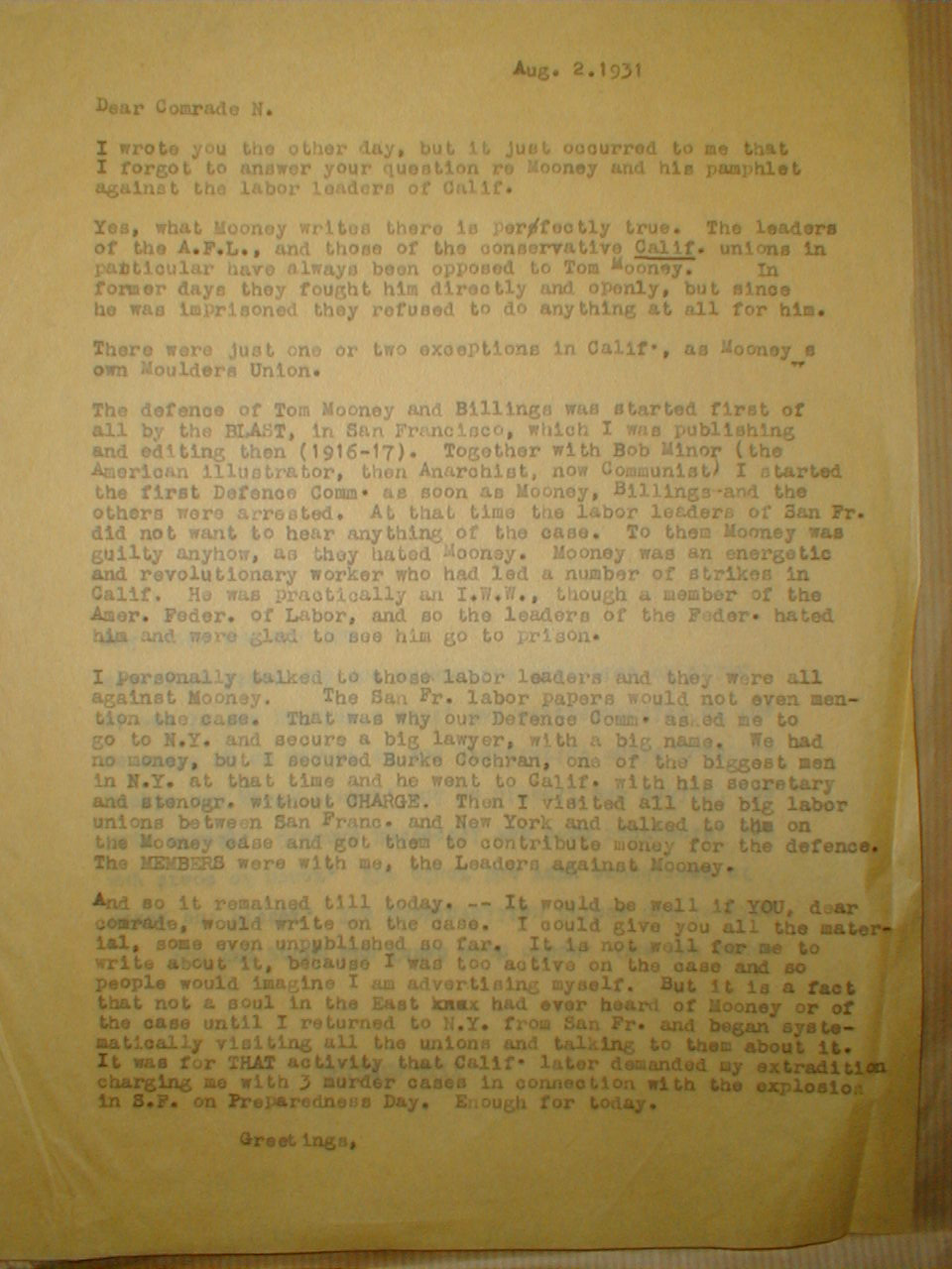 And so it remained till today. -- It would be well if YOU, dear comrade, would write on the case. I could give you all the material, some even unpublished so far. It is not well for me to write about it, because I was too active on the case and so people would imagine I am advertising myself. But it is a fact that not a soul in the East had ever heard of Mooney or of the case until I returned to N.Y. from San Fr. and began systematically visiting all the unions and talking to them about it. It was for THAT activity that Calif. later demanded my extradition charging me with 3 murder cases in connection with the explosion in S.F. on Perparadness Day. Enough for today.