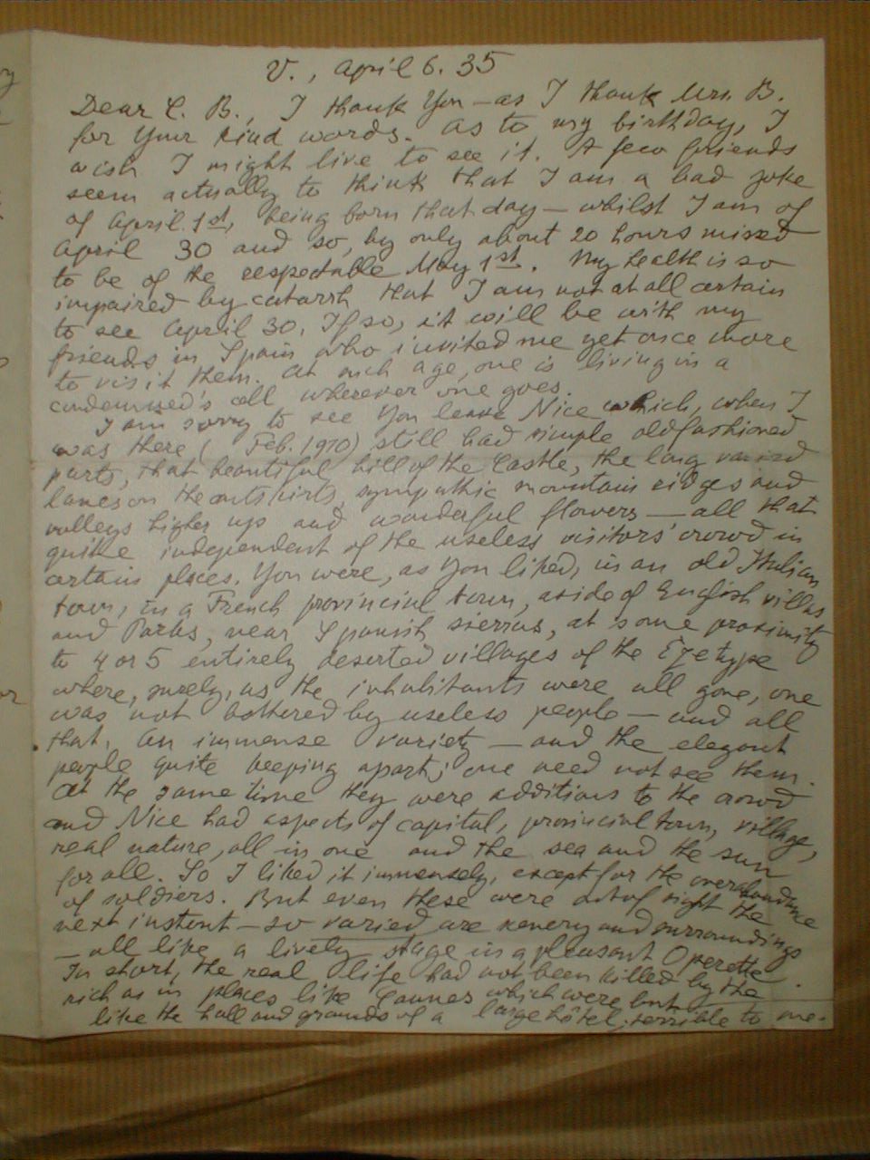 Dear C.B., I thank you -- as I thank Mrs. B. for your kind words. As to my birthday, I wish I might live to see it. A few friends seem actually to think that I am a bad joke of April 1rst, being from that day -- whilst I am of April 30 and so, but only about 20 hours missed to be of the respectable May 1st. My health is so impaired by cata**rsh. that I am not at all certain to see April 30. If so, it will be with my friends in Spain who invited me to once more to visit them. At my age, one is living in a condemned's call wherever one goes.