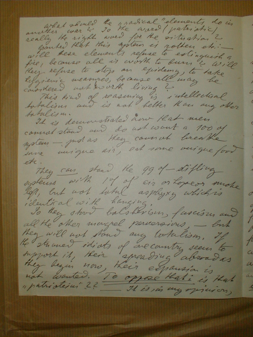 So they stood balsherism, fascism and all the other mongrel perversions, -- but they will not stand any totalism. If the stu**me*t idiots of our country seem to support it, their spreading abroad as they begin now, their expansion is not wanted. To opposed that: is that "patriotism"?? -- It is, in my opinion,