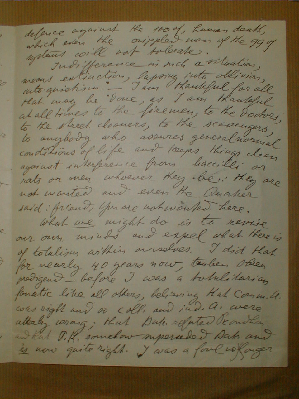 What we might so is to revise our own minds and expel what there is of totalism written ourselves. I did that for mearly 40 years now, t***ben other prodigen* -- before I was a totalitarian fanatic like all others, believing that comm. U. was right and no coll. and ind. A. were utterly wrong; that Du*e. refuted ****hon and ** A.K. somehow superseded *ak and is now quite right. I was a fool no longer