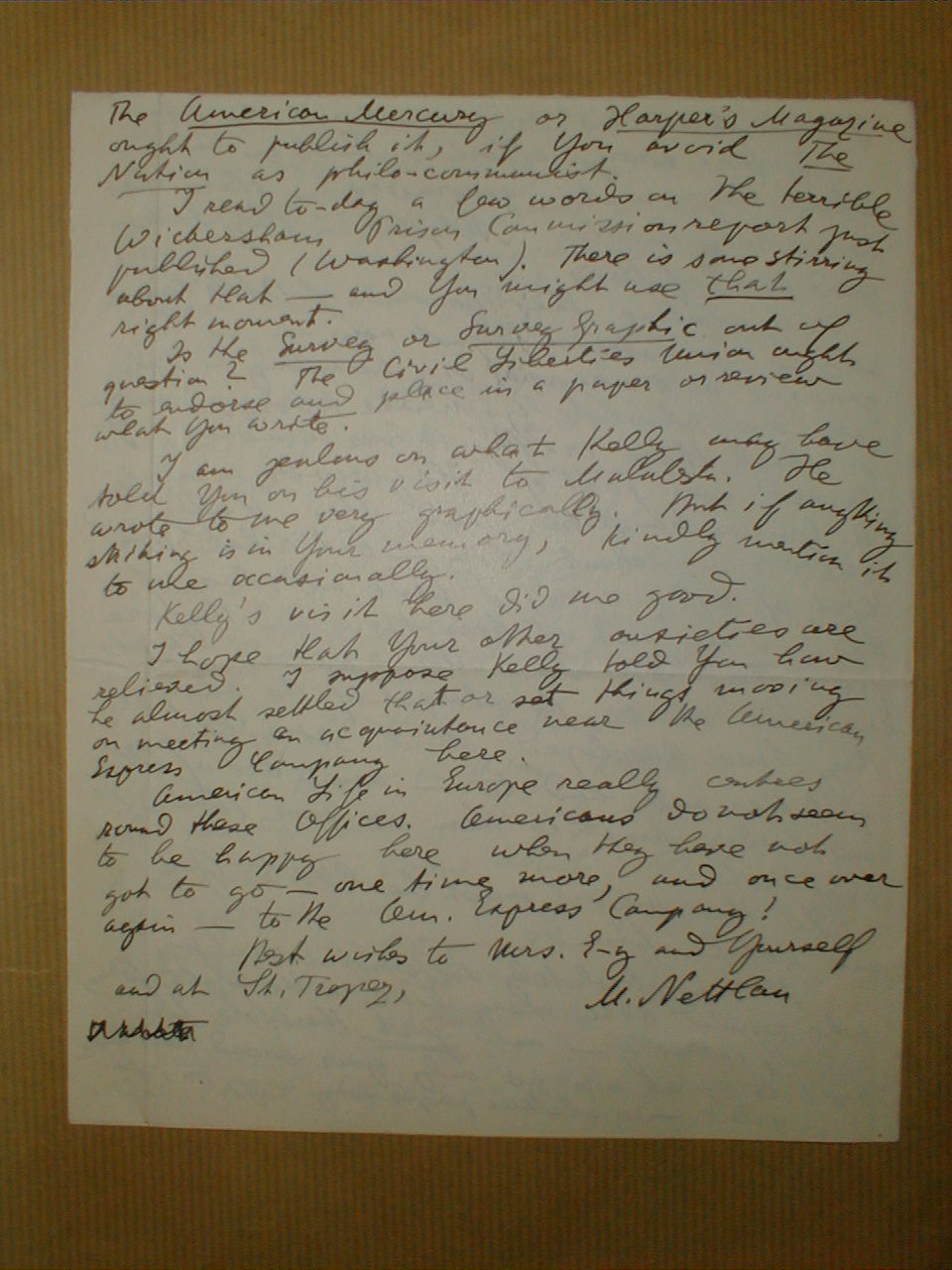 I read to-day a few words on the terrible Wicbersham Prison Commission report just published (Washington). There is some stirring about that – and you might use that right moment.