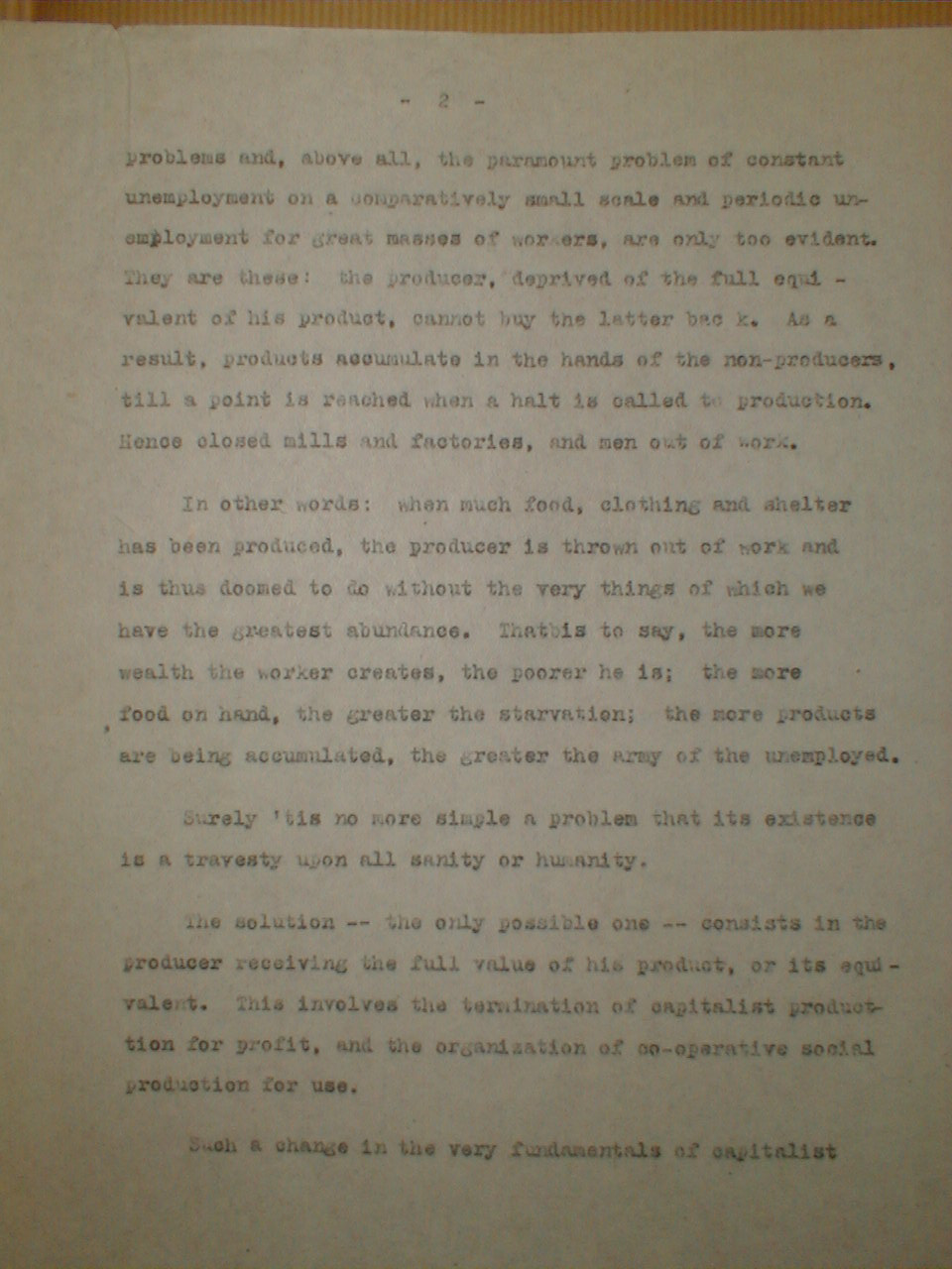 The solution -- the only possible one -- consists in the producer receiving the full value of his product, or its equivalent. This involves the termination of capitalist production for profit, and the organization of co-operative social production for use.