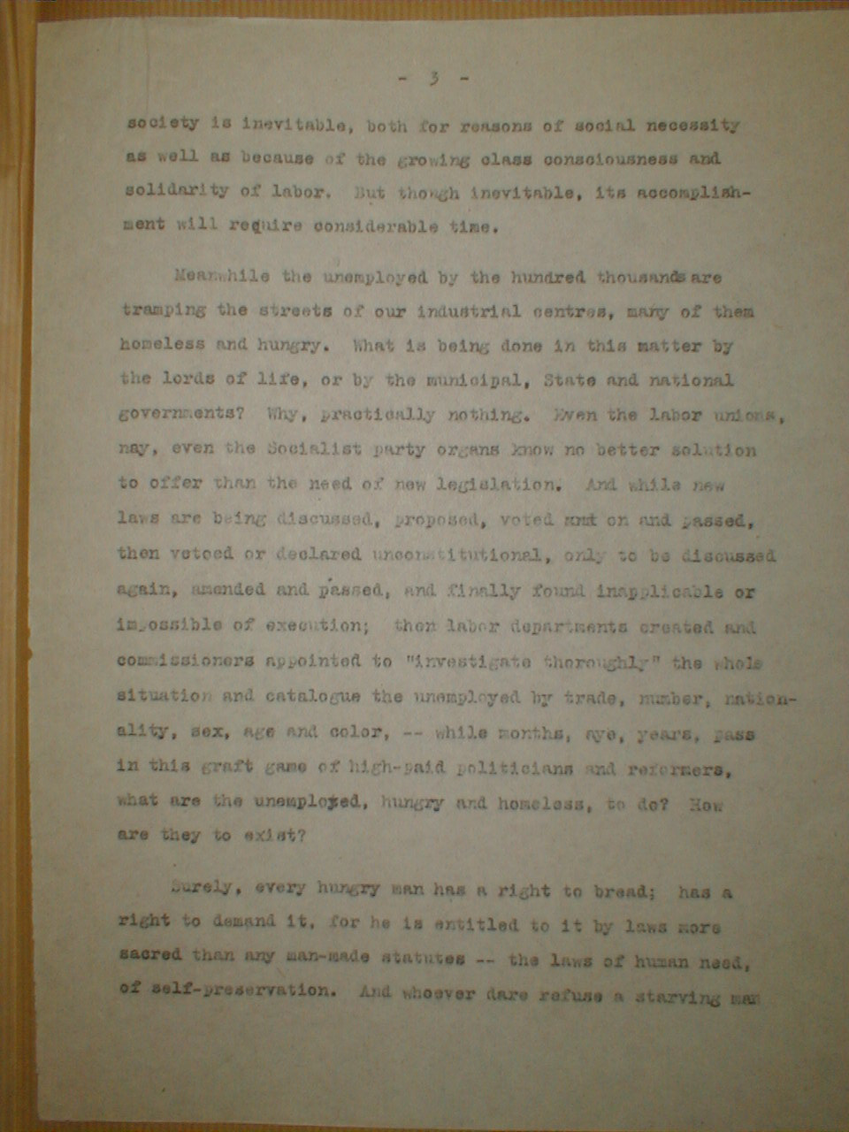 Generally speaking, there is neither any sincere and intelligent plan among the reformers, of whatever hue, to solve this great problem, nor any possibility of a thorough and final solution of unemployment within the legal and industrial boundaries of present-day capitalist society. Unemployment is no sporadic pehnomenon [sic] of modern life. It is inherent in the character and mode of functioning of our industrial system. The jobless man is always with us, and industrial crises or stagnation, eliminating hundreds of thousands of workers, for a longer or shorter period, from the field of labor, are events of regular and inevitable recurrence.