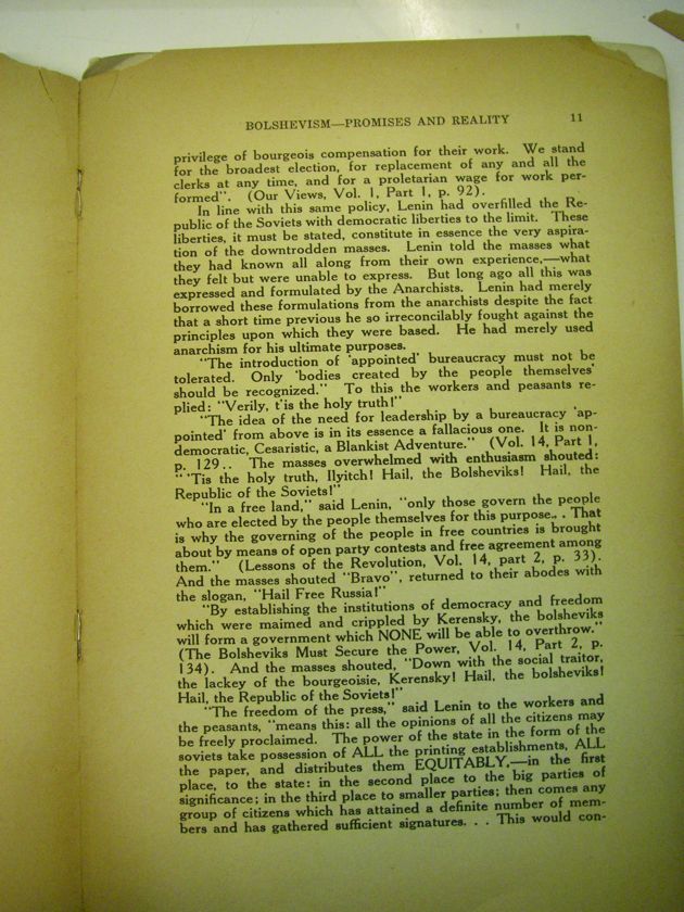 In line with this same policy, Lenin had overfilled the Republic of the Soviets with democratic liberties to the limit. These liberties, it must be stated, constitute in essence the very aspiration of the downtrodden masses. Lenin told the masses what they had known all along from their own experience,--- what they felt but were unable to express. But long ago all this was expressed and formulated by the Anarchists. Lenin had merely borrowed these formulations from the anarchists despite the fact that a short time previous he so irreconcilably fought against the principles upon which they were based. He had merely used anarchism for his ultimate purposes.