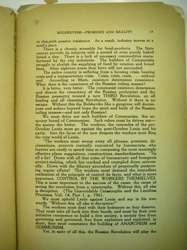 The workers must deal with their betrayers as they deserve. They must take all back into their hands, and must by their own initiative commence to build a free society, a society free from governing and governed, free from exploiters and exploited, in short, they must commence the building of ANARCHISM and COMMUNISM.