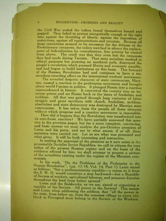The revealed despotic character of state communism, Marxism, caused a reaction in the proletarian movement and brought about world Fascism in politics. It plunged Russia into a reaction unprecedented in history. It converted the country into an immense prison and set Russia back to the times of feudalism and serfdom. All that was gained through long centuries of bitter struggle and great sacrifices with church, feudalism, serfdom, absolutism and state democracy was destroyed by Marxian state communism. It has taken from the people all those elements without which progress and a creative movement is impossible.
