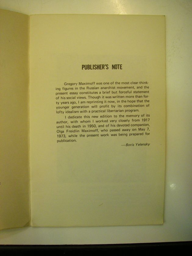 Gregory Maximoff was one of the most clear-thinking figures in the Russian anarchist movement, and the present essay constitutes a brief but forceful statement of his social views. Though it was written more than forty years ago, i am reprinting it now, in the hope that the younger generation will profit by its combination of lofty idealism with a practical libertarian program.