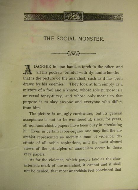 A DAGGER in one hand, a torch in the other, and all his pockets brimful with dynamite-bombs -- that is the picture of the anarchist, such as it has been drawn by his enemies. They look at him simply as a mixture of a fool and a knave, whose able, purpose is universal topsy-turvy, and whose only means to that purpose is to slay anyone and everyone who differs from him.