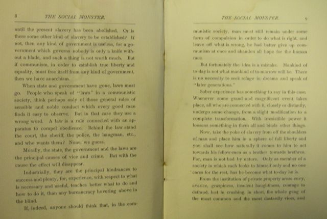 When state and government have gone, laws must go. People who speak of "laws" in a communistic society, think perhaps only of those general rules of sensible and noble conduct which every good man finds it easy to observe. But in that case they use a wrong word. A law is a rule connected with an apparatus to compel obedience. Behind the law stand the court, the sheriff, the police, the hangman, etc., and who wants them? None, we guess.