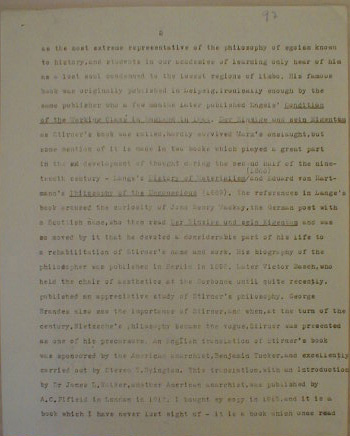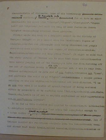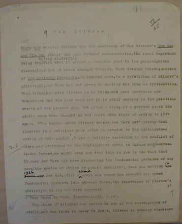 There are several reasons why the centenary of Max Stirner's The Ego and His Own should get [?] commemoration, the least important being the merely historical fact that it played a decisive part in the philosophical discussions out of which emerged Marxism. Marx devoted three-quarters of Die Deutsche Ideologie, an [?] work, to a refutation of Stirner's philosophy.