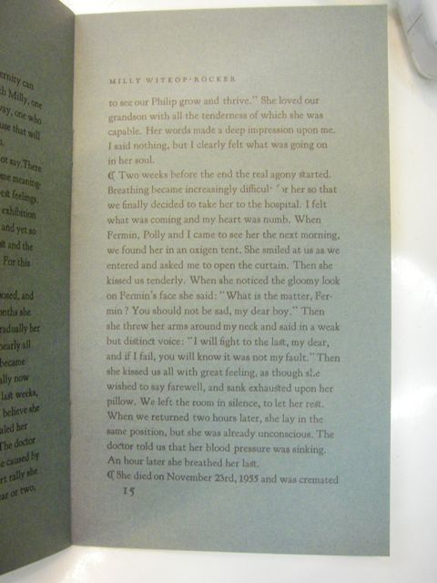 Two weeks before the end the real agony started. Breathing became increasingly difficult for her so that we finally decided to take her to the hospital. I felt what was coming and my heart was numb. When Fermin, Polly and I came to see her the next morning, we found her in an oxygen tent. She smiled at us as we entered and asked me to open the curtain. Then she kissed us tenderly. When she noticed the gloomy look on Fermin's face she said: "What is the matter, Fermin? You should not be sad, my dear boy." Then she threw her arms around my neck and said in a weak but distinct voice: "I will fight to the last, my dear, and if I fail, you will know it was not my fault." Then she kissed us all with great feeling, as though she wished to say fairwell, and sank exhausted upon her pillow. We left the room in silence, to let her rest. When we returned two hours later, she lay in the same position, but she was already unconscious. The doctor told us that her blood pressure was sinking. An hour later she breathed her last.