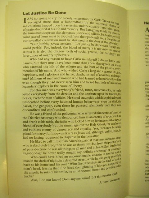 I am not going to cry for bloody vengeance, for Carlo Tresca has been revenged more than a hundredfold by the universal chorus of maledictions heaped upon his assassins and the equally tremendous praise directed at his life and memory. But I am going to add my shout to the tumultuous uproar that demands justice and will not be denied, even if some sacred ikons must be toppled from their pedestals and a few pillars of our so called civilization must lie shattered in the dust of the ignominy.