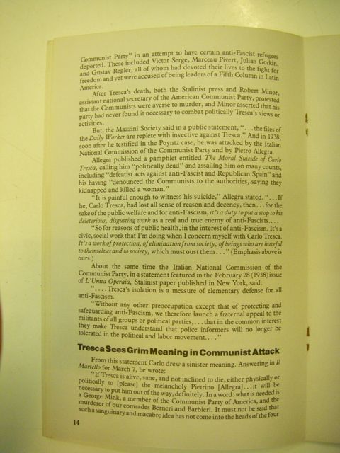 But, the Mazzini Society said in a public statement, "... the files of the Daily Worker are replete with invective against Tresca." And in 1938, soon after he testified in the Poyntz case, he was attacked by the Italian National Commission of the Communist Party and by Pietro Allegra.