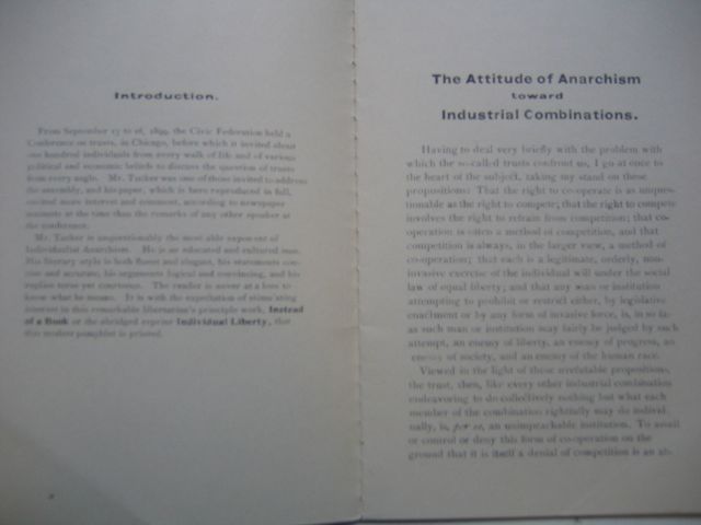 Mr. Tucker is unquestionably the most able exponent of Individualist Anarchism. He is an educated and cultured man. His literary style is both fluent and elegant, his statements creative and accurate, his arguments logical and convincing, and his replies terse, yet courteous. It is with the expectation of stimulating interest in this remarkable libertarian's principle work, Instead of a Book or the abridged eimprint Individual Liberty, that this modest pamphlet is printed.