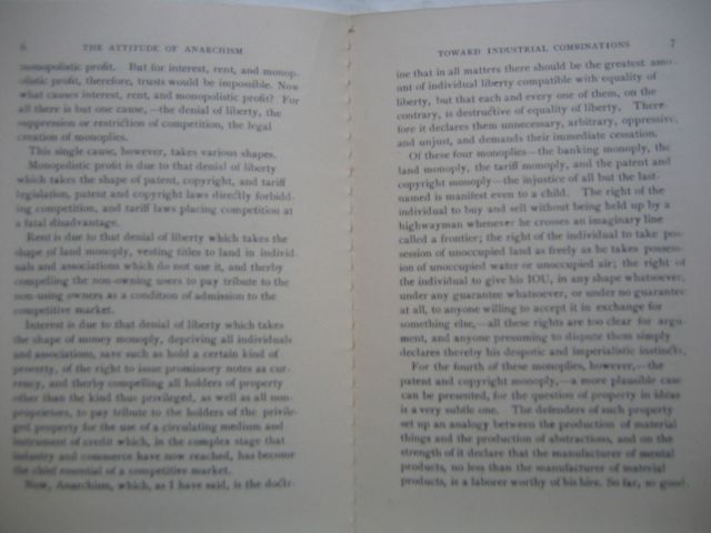 Of these four monopolies -- the banking monopoly, the land monopoly, the tariff monopoly, and the patent and copyright monopoly -- the injustice of all but the last- named is manifest even to a child. The right of the individual to buy and sell without being held up by a highwayman whenever he crosses an imaginary line called a frontier; the right of the individual to take possession of unoccupied water or unoccupied air; the right of the individual to give his IOU, in any shape whatsoever, under any guarantee whatsoever, or under no guarantee at all, to anyone willing to accept it in exchange for something else,--all these rights are too clear for argument, and anyone presuming to dispute them simply declares thereby his despotic and imperialistic instincts.
