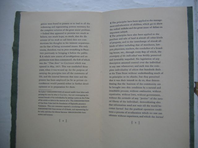 The principles have also been applied to the purchase and sale of land & almost all other kinds of property, and to the interchange of almost all kinds of labor including that of merchants, lawyers, physicians, teachers, the conductor of a boarding house, etc., through every step of which, the sovereignty of the individual was strictly preserved and invariably respected. No legislation of any description assumed control over the individual in any case whatsoever; and such was the complete individuality of action that hundreds dealt at the Time Store without understanding much of its principles or its objects; but they perceived that it was their interest to do so, thus demonstrating that the business of the community can be brought into this condition by a natural and irresistable process; without combination, without organisation, without laws, without government, without the surrender of any "portion" of the natural liberty of the individual; demonstrating also that reformation need not wait till the world becomes learned: but the practical operation constitutes a process of re-education which no one can estimate without experience, and which the learned