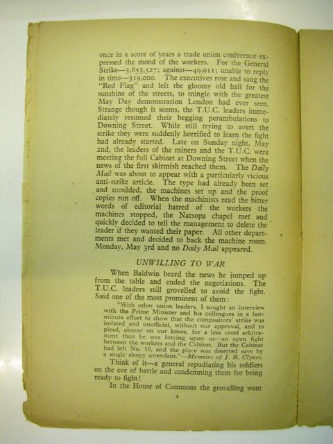 once in a score of years a trade union conference expressed the mood of the workers. For the General Strike - 3,653,527; against - 49,911; unable to reply in time - 319,000. The executives rose and sang the "Red Flag" and left the gloomy old hall for the sunshine of the streets, to mingle with the greatest May Day demonstration London had ever seen. Strange though it seems, the T.U.C. leaders immediately resumed their begging perambulations to Down Street. While still trying to avert the strike they were suddenly horrified to learn the fight had already started. Late on Sunday night, May 2nd, the leaders of the miners and the T.U.C. were meeting the full cabinet at Downing Street when the news of the first skirmish reached them. The Daily Mail was about to appear with a particularly vicious anti-strike article. The type had already been set and moulded, the machinists set up the proof copies run off. When the machinists read the bitter words of editorial hatred of the workers the machines stopped, the Natsopa chapel met and quickly decided to tell the management to delete the leader if they wanted their paper. All other departments met and decided to back the machine room. Monday, May 3rd and no Daily Mail appeared.