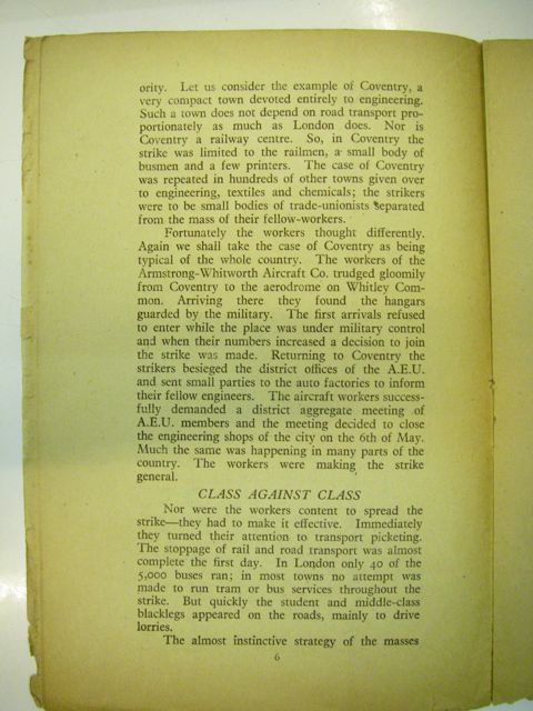 ority. Let us consider the example of Coventry, a very compact town devoted entirely to engineering. Such a town does not depend on road transport proportionately as much as London does. Nor is Coventry a railway centre. So, in Coventry the strike was limited to the railmen, a small body of busmen and a few printers. The case of Coventry was repeated in hundreds of other towns given over to engineering, textiles and chemicals; the strikers were to be small bodies of trade-unionists separated from the mass of their fellow-workers.