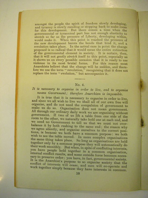 It is true that it is necessary to organise in order to live, and since we all wish to live we shall all of our own free will organise, and do not need the compulsion of government to make us do so. Organisation does not mean government. All through our ordinary daily work we are organising without government. If two of us lift a table from one side of the room to the other, we naturally take hold one at each end, and we need no Government to tell us that we must not over-balance it by both rushing to the same end; the reason why we agree silently, and organise ourselves to the correct positions, is because we both have a common purpose: we both wish to see the table moved. In more complex organisations the same thing takes place. So long as organisations are held together only by a common purpose they will automatically do their work smoothly. But when, in spite of conflicting interests, you have people held together in a common organisation, internal conflict results, and some outside force becomes necessary to preserve order; you have, in fact, governmental society. It is the Anarchist's purpose to so organise society that the conflict of interests will cease, and men will co-operate and work together simply because they have interests in common.