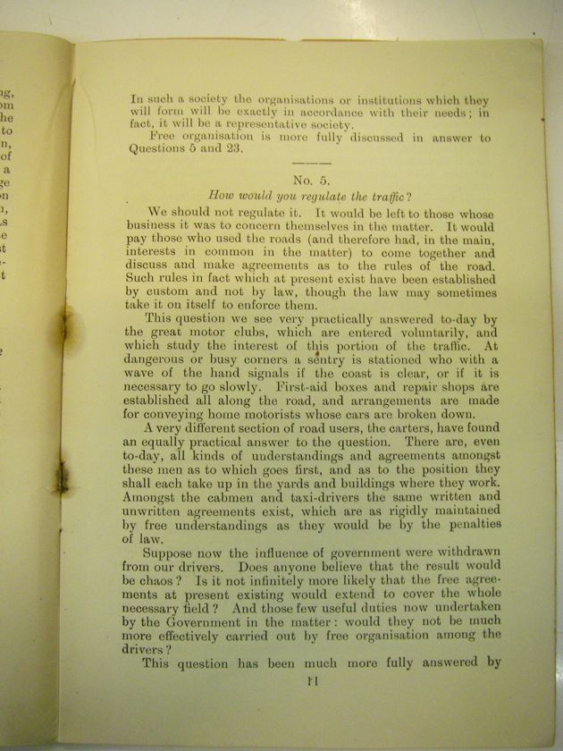 Suppose now the influence of government were withdrawn from our drivers. Does anyone believe that the result would be chaos? Is it not infinitely more likely that the free agreements at present existing would extend to cover the whole necessary field? And those few useful duties now undertaken by the Government in the matter: would they not be much more effectively carried out by free organisation among the drivers?