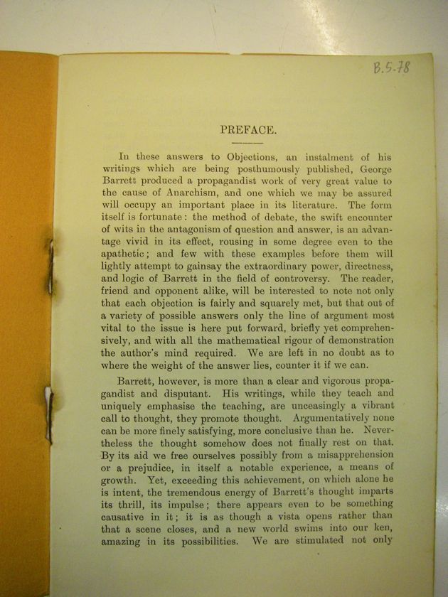 In these answers to Objections, an instalment of his writings which are being posthumously published, George Barrett produced a propagandist work of very great value to the cause of Anarchism, and one which we may be assured will occupy an important place in its literature. The form itself is fortunate: the method of debate, the swift encounter of wits in the antagonism of question and answer, is an advantage vivid in its effect, rousing in some degree even to the apathetic; and few with these examples before them will lightly attempt to gainsay the extraordinary power, directness, and logic of Barrett in the field of controversy. The reader, friend and opponent alike, will be interested to note not only that each objection is fairly and squarely met, but that out of a variety of possible answers only the line of argument most vital to the issue is here put forward, briefly yet comprehensively, and with all the mathematical rigour of demonstration the author's mind required. We are left in no doubt as to where the weight of the answer lies, counter it if we can.
