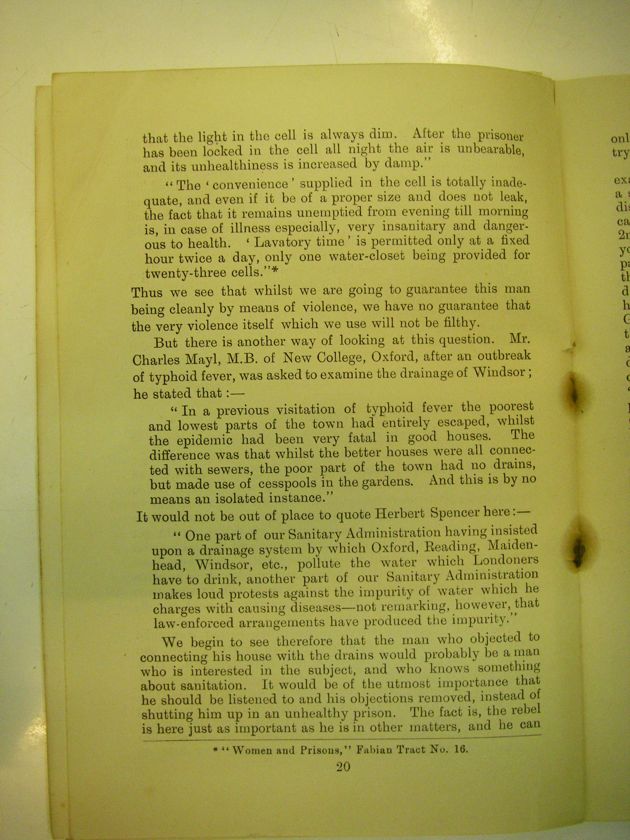 "The 'convenience' supplied in the cell is totally inadequate, and even if it be of a proper size and does not leak, the fact that it remains unemptied from evening till morning is, in case of illness especially, very insanitary and dangerous to health. 'Lavatory time' is permitted only at a fixed hour twice a day, only one water-closet being provided for twenty-three cells."*