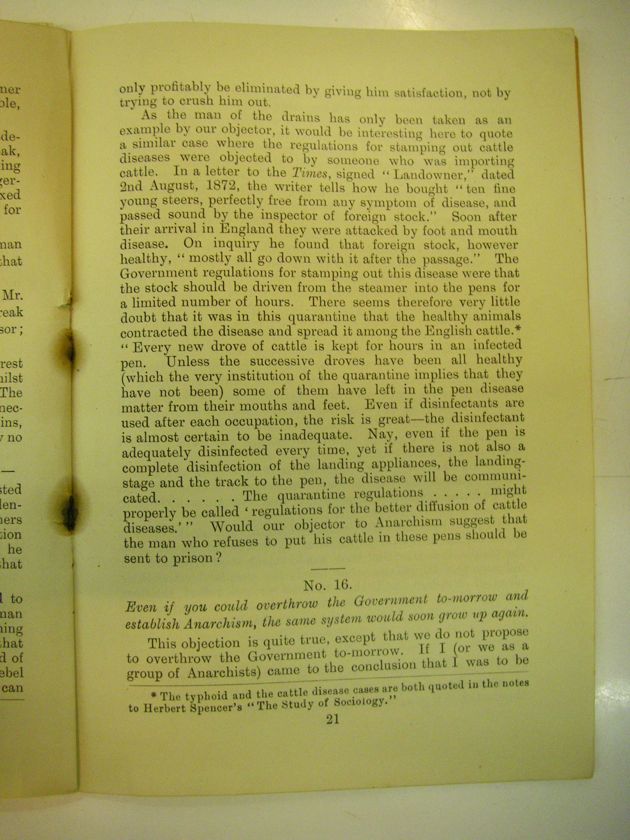 As the man of the drains has only been taken as an example by our objector, it would be interesting here to quote a similar case where the regulations for stamping out cattle diseases were objected to by someone who was importing cattle. In a letter to the Times, signed "Landowner," dated 2nd August, 1872, the writer tells how he bought "ten fine young steers, perfectly free from any symptom of disease, and passed sound by the inspector of foreign stock." Soon after their arrival in England they were attacked by foot and mouth disease. On inquiry he found that foreign stock, however healthy, "mostly all go down with it after the passage." The Government regulations for stamping out this disease were that the stock should be driven from the steamer into the pens for a limited number of hours. There seems therefore very little doubt that it was in this quarantine that the healthy animals contracted the disease and spread it among the English cattle.* "Every new drove of cattle is kept for hours in an infected pen. Unless the successive droves have been all healthy (which the very institution of the quarantine implies that they have not been) some of them have left in the pen disease matter from their mouths and feet. Even if disinfectants are used after each occupation, the risk is great — the disinfectant is almost certain to be inadequate. Nay, even if the pen is adequately disinfected every time, yet if there is not also a complete disinfection of the landing appliances, the landing-stage and the track to the pen, the disease will be communicated.... The quarantine regulations ... might properly be called 'regulations for the better diffusion of cattle diseases.'" Would our objector to Anarchism suggest that the man who refuses to put his cattle in these pens should be sent to prison?