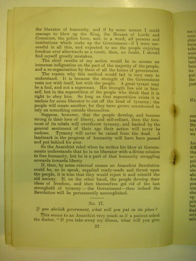 So the Anarchist rebel when he strikes his blow at Governments understands that he is no liberator with a divine mission to free humanity, but he is a part of that humanity struggling onwards towards liberty.