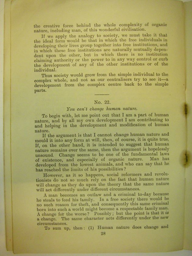 If the argument is that I cannot change human nature and mould it into any form at will, then, of course, it is quite true. If, on the other hand, it is intended to suggest that human nature remains ever the same, then the argument is hopelessly unsound. Change seems to be one of the fundamental laws of existence, and especially of organic nature. Man has developed from the lowest animals, and who can say that he has reached the limits of his possibilities?