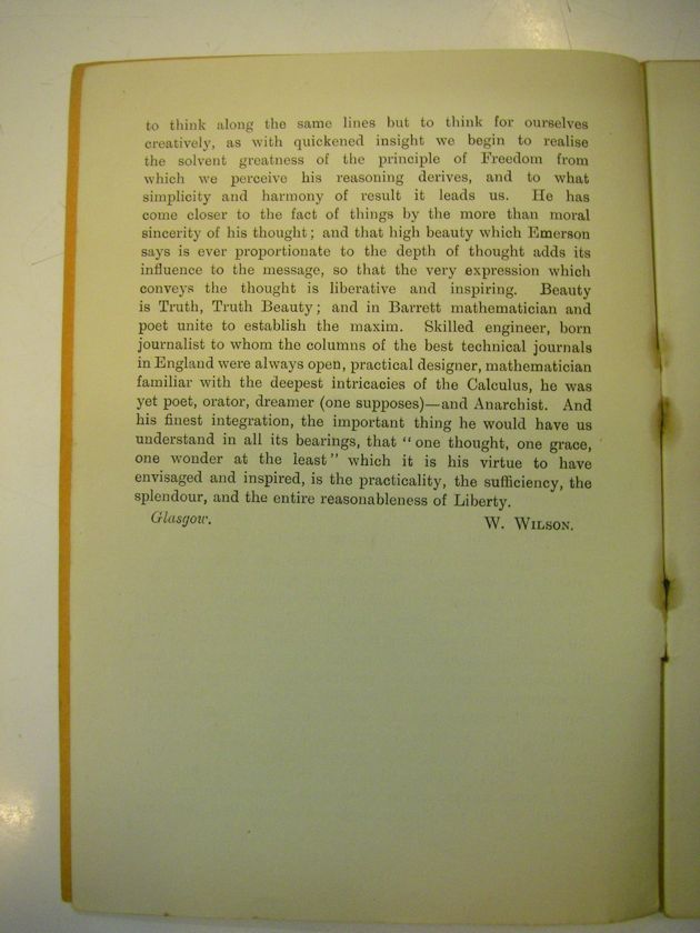 to think along the same Hnes but to think for ourselves creatively, as with quickened insight we begin to realise the solvent greatness of the principle of Freedom from which we perceive his reasoning derives, and to what simplicity and harmony of result it leads us. He has come closer to the fact of things by the more than moral sincerity of his thought; and that high beauty which Emerson says is ever proportionate to the depth of thought adds its influence to the message, so that the very expression which conveys the thought is liberative and inspiring. Beauty is Truth, Truth Beauty; and in Barrett mathematician and poet unite to establish the maxim. Skilled engineer, born journalist to whom the columns of the best technical journals in England were always open, practical designer, mathematician familiar with the deepest intricacies of the Calculus, he was yet poet, orator, dreamer (one supposes) — and Anarchist. And his finest integration, the important thing he would have us understand in all its bearings, that "one thought, one grace, one wonder at the least" which it is his virtue to have envisaged and inspired, is the practicality, the sufficiency, the splendour, and the entire reasonableness of Liberty.