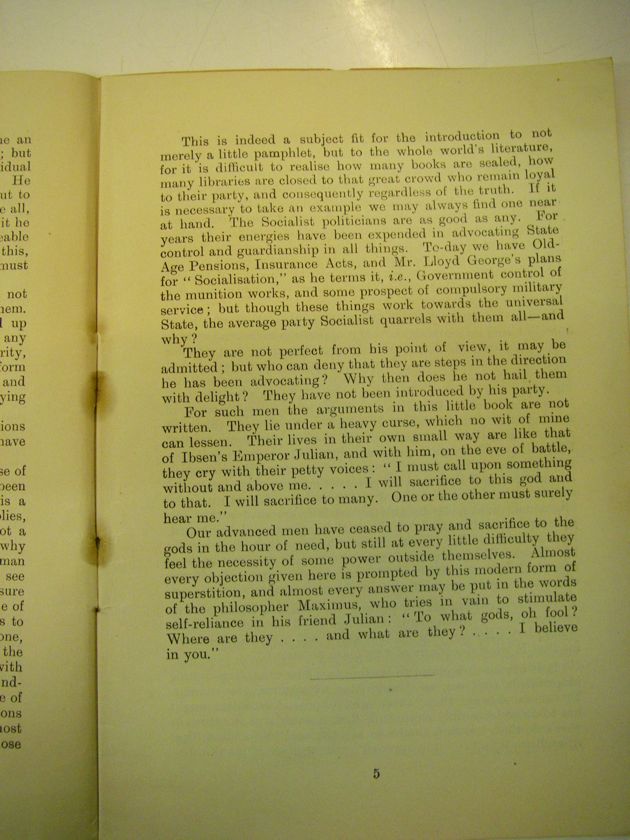 This is indeed a subject fit for the introduction to not merely a little pamphlet, but to the whole world's literature, for it is difficult to realise how many books are sealed, how many libraries are closed to that great crowd who remain loyal to their party, and consequently regardless of the truth. If it is necessary to take an example we may always find one near at hand. The Socialist politicians are as good as any. For years their energies have been expended in advocating State control and guardianship in all things. To-day we have Old-Age Pensions, Insurance Acts, and Mr. Lloyd George's plans for "Socialisation," as he terms it, i.e., Government control of the munition works, and some prospect of compulsory military service; but though these things work towards the universal State, the average party Socialist quarrels with them all — and why?